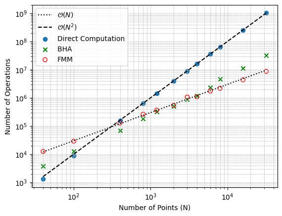 For my numerical methods class, I studied the Fast Multipole Method (FMM). This clever technique allows for quick distance-independent calculations of far-field potential functions between many points. Envision a cluster of \(n\) stars interacting with each other gravitationally. To calculate the gravitational potential at each star from each other star, we would ordinarily need \(\mathcal{O}\left(n^2\right)\) operations, but with the FMM, this can be accelerated to a linear \(\mathcal{O}\left(n\right)\) operation.