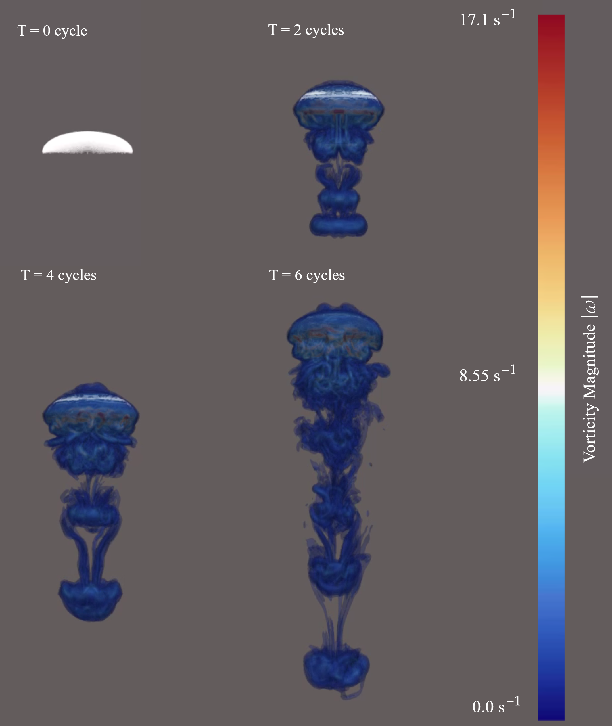 The underlying modelling challenge is a fluid-solid interaction problem in which the jellyfish body dynamically interacts with the surrounding fluid. In fluid-solid simulations, both the fluid and solid domains need to be evolved while enforcing interfacial momentum exchange. The current research approach to model jellyfish is the immersed boundary technique, in which the solid phase is represented a Lagrangian force density embedded within an Eulerian fluid domain. Simulations are performed using IBAMR , a high-performance, parallelised implementation of the immersed boundary method that uses adaptive mesh refinement to resolve small-scale features near the fluid-solid interface.