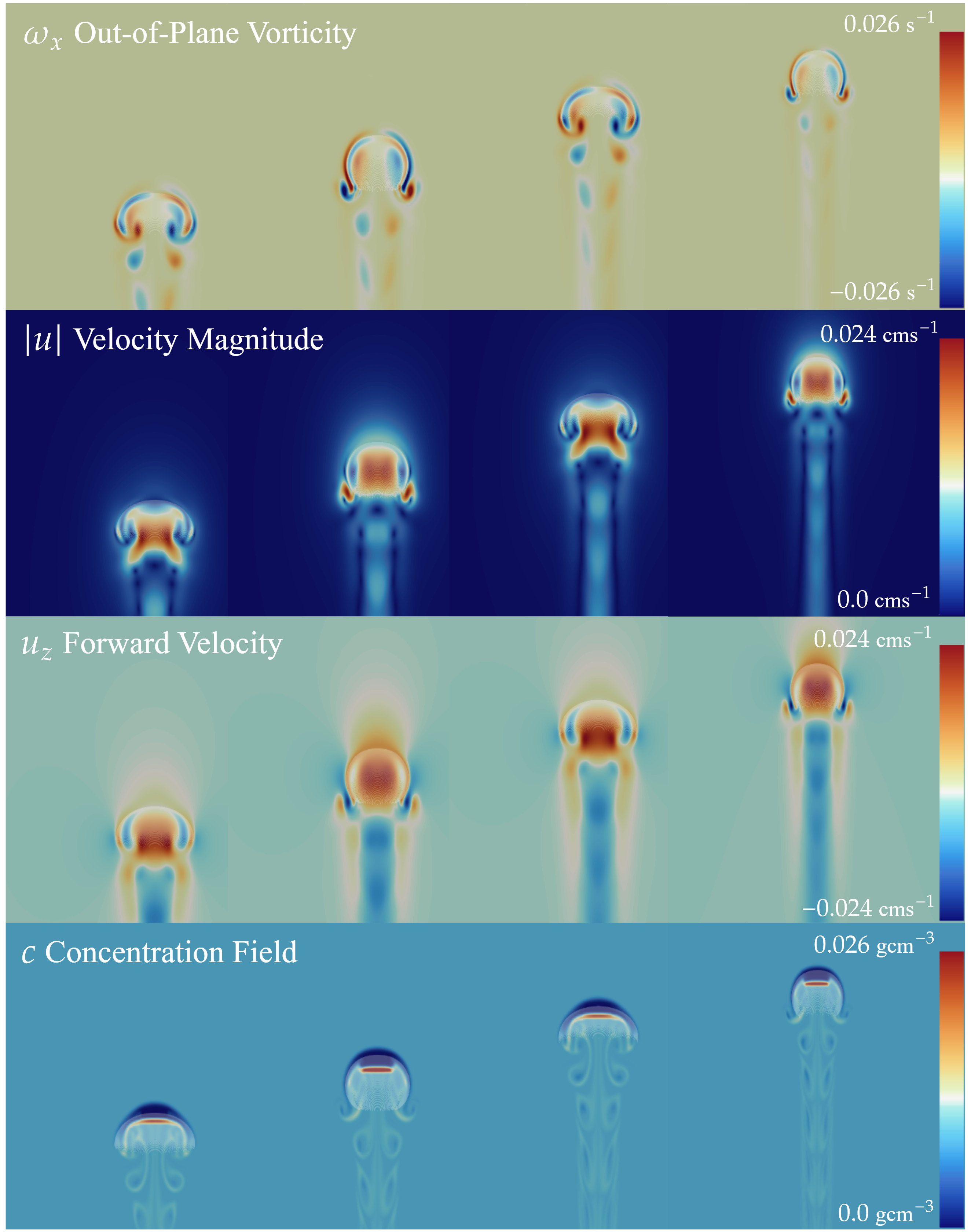 Currently, I am working with the Dunkel group through MIT’s Summer Program for Undergraduate Research (SPUR), where I am investigating nutrient transport in feeding jellyfish via fluid dynamic simulations. During locomotion, jellyfish generate vortex rings that both propel the jellyfish forward and pull nutrient-rich fluid toward the jellyfish’s underside for consumption. This project examines the coupling between paddling kinematics and nutrient uptake. An energy cost can be calculated for distinct paddling gaits, which the jellyfish must then recover with energy obtained from the ingested food. By varying over paddling motion and frequencies, the project aims to optimise food transport dynamics, showing that simulated results match observational jellyfish studies.